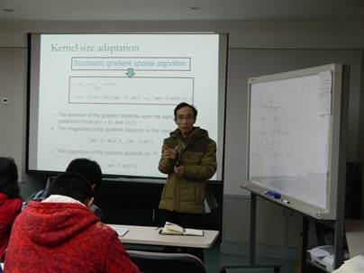 在26日下午的讲座中,陈老师以信息理论学习为中心,讲述了包括二阶统计量,信息熵等内容,并介绍了这些统计量在人脸识别、特征提取等领域具有广泛的应用价值。在27日,陈教授介绍了核方法,以核自适应滤波为中心着重介绍了核方法的研究方向和应用价值。然后,陈教授以一个神经编码的应用例子,详细地说明了核方法的应用意义,并指出核方法在人脸识别系统,天文学观测等领域已经取得了很好的应用结果。报告的最后,陈教授总结了此次报告的主要内容,指出了未来的研究方向,并希望与会师生在以后的工作中,将信息理论学习与核方法扩展到图像配准、目标识别、分类算法等领域中。报告中,到场的老师与学生积极参与了相关知识的讨论与交流,此次学术报告取得了积极的反响和良好的效果。