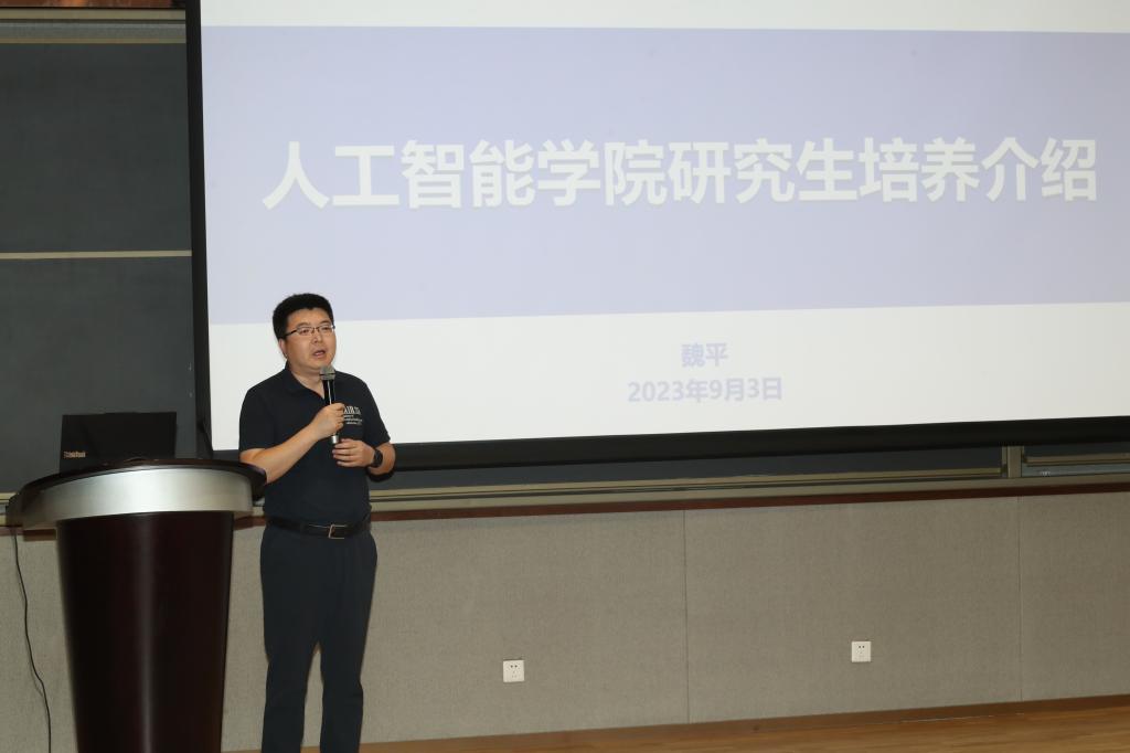 副院长魏平教授介绍研究生培养体系,重点向学生们介绍了硕士、博士的学习年限,课程学习的必修环节和要求,重点强调了需要遵守的学术道德规范,知识产权保护与技术保密制度和考勤制度。