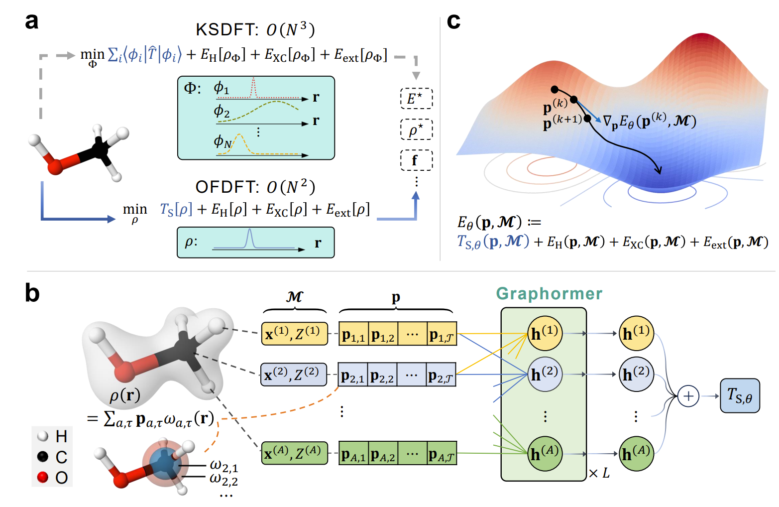 图1. M-OFDFT框架概览 (a) 相比较KSDFT,无轨道密度泛函理论(OFDFT)理论复杂度更低; (b) 基于非局域图神经网络的动能密度泛函模型,该模型以电子密度系数和分子构象作为输入预测分子的电子动能;(c) 动能泛函模型训练完成后,M-OFDFT通过不断优化电子密度系数求解基态电子密度及分子相关性质。