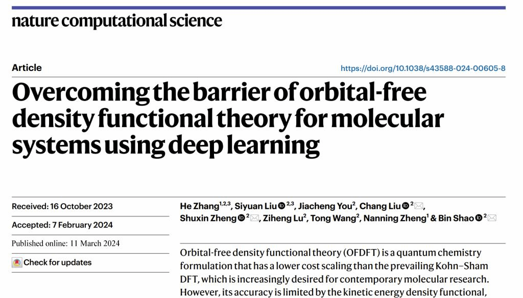 博士生张贺与微软亚洲研究院AI for Science团队联合提出了基于人工智能技术和无轨道密度泛函理论的新型电子结构计算框架(M-OFDFT),不仅显著超越了传统KSDFT的计算效率,还能保有其求解精度,为分子科学研究提供了一种新颖的、更具潜力的研究工具。相关研究成果“Overcoming the Barrier of Orbital-Free Density Functional Theory for Molecular Systems Using Deep Learning在Nature子刊《自然计算科学》(Nature Computational Science)在线发表,第一作者为博士生张贺(导师郑南宁教授),第一作者单位为成人在线