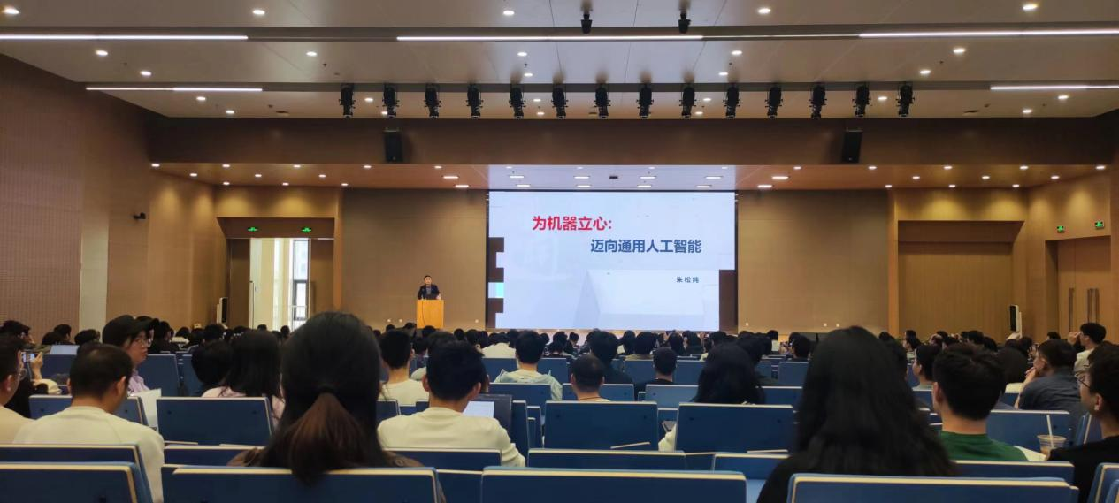 院长辛景民教授的欢迎辞中拉开了帷幕。本次报告首先介绍了当前国际科技竞争态势与我国人工智能发展战略,指出迈向通用人工智能是中国未来人工智能发展的新方向。朱松纯教授从通用人工智能的软硬件生态和应用前景等方面向大家全方位展示了通用人工智能对中国人工智能发展战略变革的重要意义,并以通用智能人——小女孩“通通”为例向大家进行更加生动形象的展示,同时指出基于数据驱动的大模型缺“心”,缺乏明确价值体系的问题,由此阐释了通用人工智能的三个基本条件:实现无限任务、自主生成任务以及价值驱动。小数据,大任务,更加强调自主智能的“乌鸦”范式是关键。