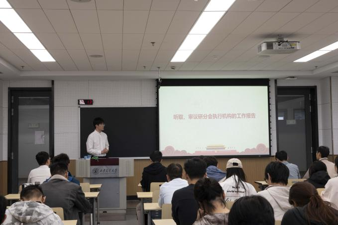院研会主席团候选人陈帅嘉对院研会进行了工作总结,为学院老师和学生代表们介绍了研究生会承担、举办的各类文体活动和工作。他代表院研会,向老师和全体学生代表们许下承诺,大家将继续做好各类学生工作,为全体同学创造一个更好的生活和科研氛围。