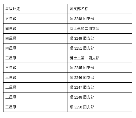 团委共评定出1个五星级团支部,3个四星级团支部和6个三星级团支部。最终结果公示如下: