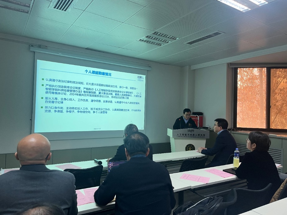 书记兰旭光进行了年度党建工作汇报及个人述职。他围绕强化基层党建工作、筑牢团队文化、引领高质量队伍发展等方面,汇报了2024年党建工作取得的成果。兰书记指出,学院始终坚持以新时代中国特色社会主义思想凝心铸魂,不断强化理论学习,促进理论与实践的深度融合,筑牢教师们的思想根基。同时,学院积极探索AI新时代下的“大思政课”建设新模式,有效促进团队文化的繁荣发展。兰书记表示,2025年学院将继续坚持党的领导,扎实推进“以教定编,以研设岗”制度改革,切实将党建工作与业务工作深度融合,全面落实立德树人根本任务,致力于培育更多高素质人才,并在服务国家战略科研创新方面力求取得新突破。