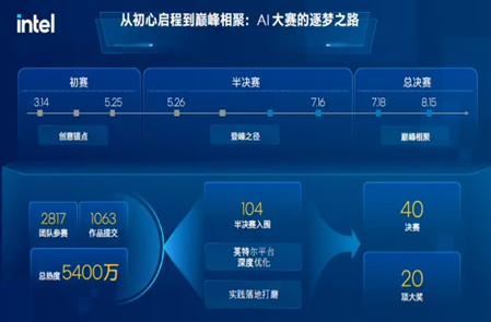 本次大赛是2025年3月启动的AI应用创新赛事,为选手提供了软硬协同的优化,包括PyTorch、OpenVINO、AI PC Open Gateway(AOG)等主流开源框架、量化和开发工具在内的全栈软件工具链,历时五个月,从初赛阶段的创意萌发,到半决赛后的方案打磨,再到决赛现场的巅峰对决,5 个月的时间里,大赛总热度突破 5400 万,吸引了中小企业、高校师生、行业工程师乃至少年群体的广泛参与。