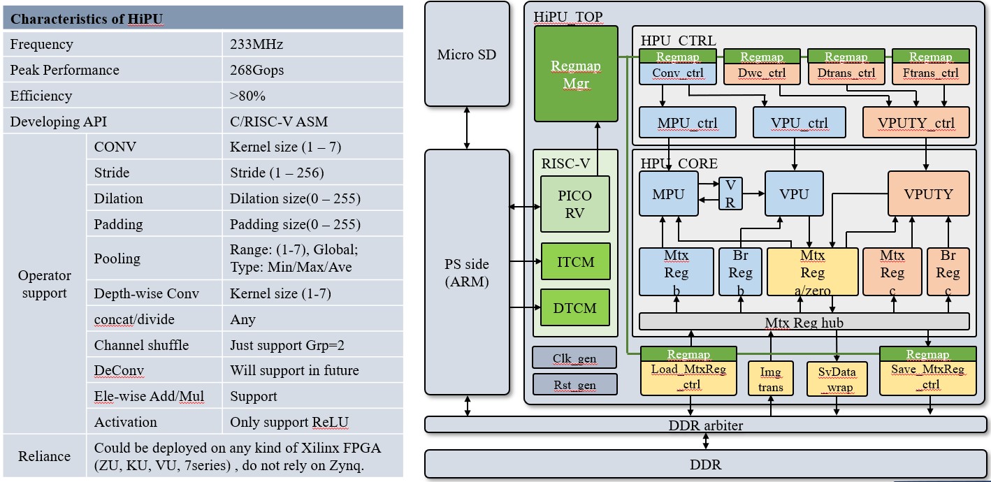 由于我们团队设计的HiPU主要面向专用集成电路(AISC),FPGA上的设计实现主要是进行功能的验证,因此,针对赛方提供的计算平台,我们需要进行适当的裁剪需,以适应ZU3的资源。如下图所示为裁剪后的HiPU设计框图,及其特性。HiPU工作在233MHz,其峰值算力为268Gops;采用C/RISC-V汇编作为编程接口,卷积效率平均在80%以上。
