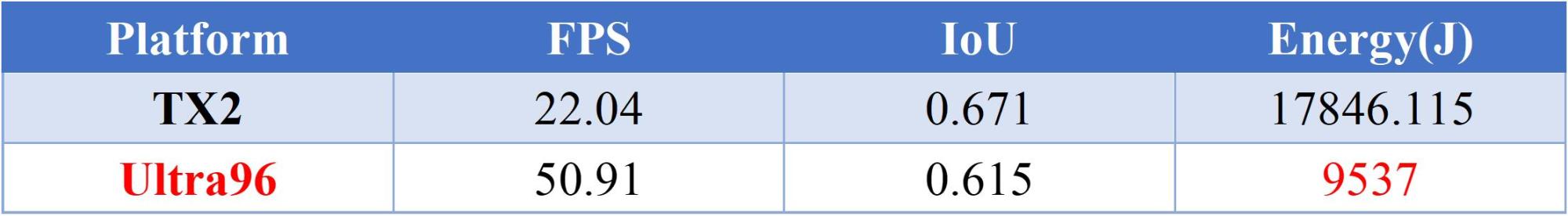 经过上述优化,我们团队的设计在比赛方的数据集上测得如下结果:准确率IoU为61.5%;能耗为9537J,帧率为50.91Hz,功率为9.248W。