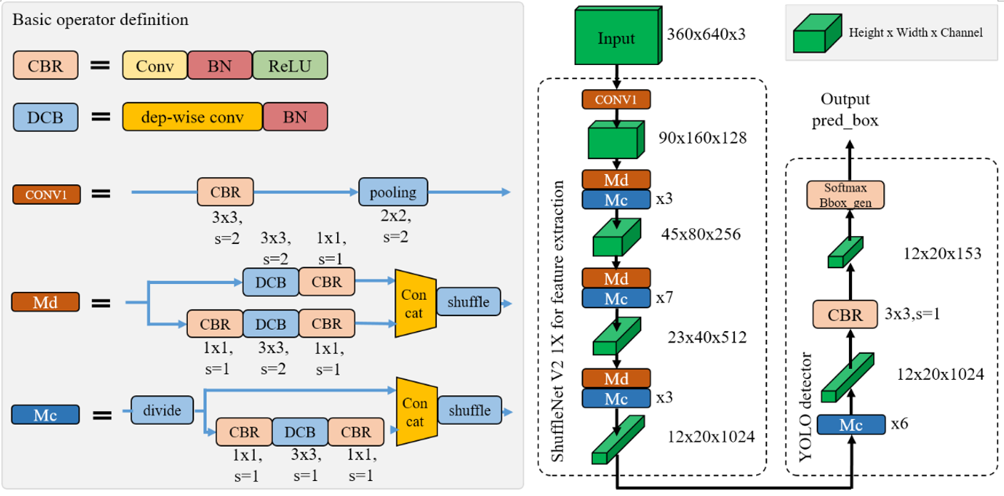 为满足移动端的检测实时性,我们团队最终选定了YOLO作为基础检测算法。并将其中的特征提取网络替换为轻量级的ShuffleNet V2,其参数规模略大于1X。如下图所示为我们定制的单目标检测网络,ShuffleDet。
