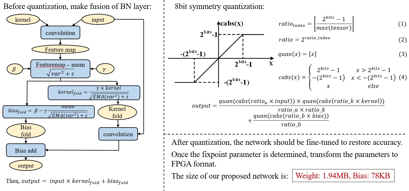 为了适应FPGA的定点运算,待整体参数训练完成后,需要对所有参数进行量化操作。我们团队将网络参数和feature map均量化为8bit定点。量化过程主要分为以下几步:1) 将BN层合并到参数中;2) 将合并后的参数进行对称量化;3) 量化后的参数如果直接使用,精度损失过于严重。因此量化后还需要对参数进行fine tune。如下图所示为量化操作的示意图。