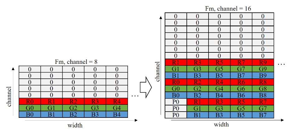 HiPU一次并行计算8个输入channel。然而网络第一层输入图像仅有RGB这3个通道,导致HiPU计算效率仅为3/8。因此,我们团队针对输入图像设计了一个转换模块。如果Conv1的kernel的width为3,则将输入图像的通道从3扩展到9。最终使得第一层的处理效率从0.38提升到了0.56,其转换示意图如下图所示。